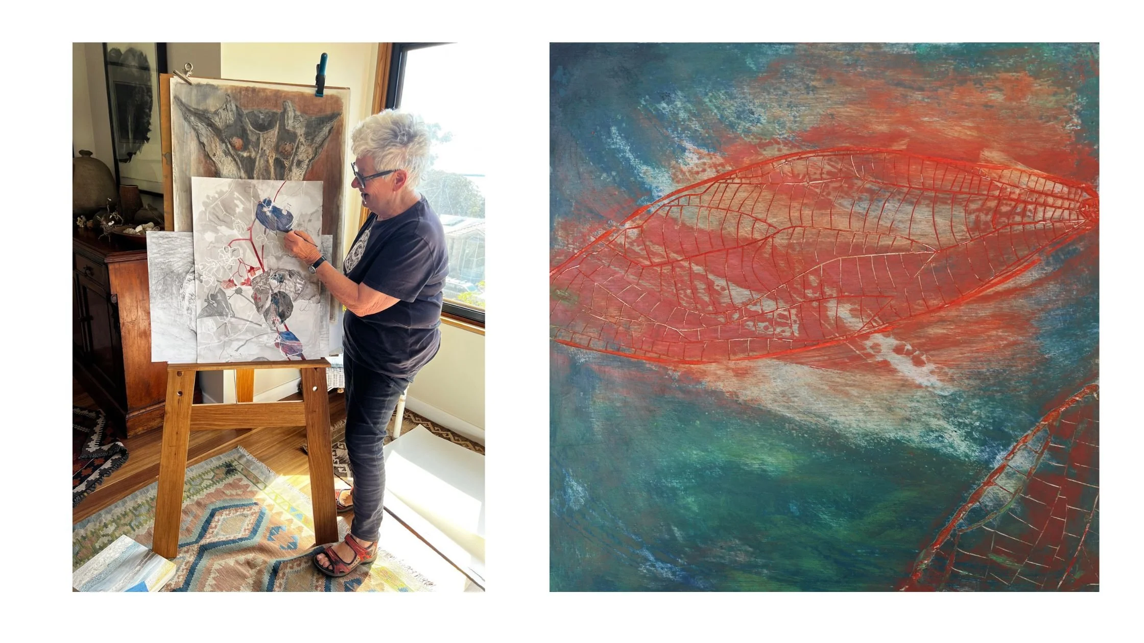 Left: Judy Panucci in studio. Right: Cicada; summer child